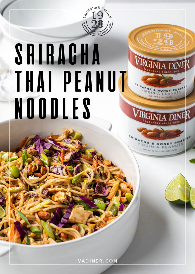 This peanut sesame noodle dish is fragrant with toasted Asian sesame oil and the nutty goodness of peanut butter and crushed Virginia Diner Sriracha and Honey Roasted Peanuts that provide the perfect sweet and tangy kick.